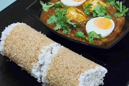 അതിനുശേഷം ഒരു മിക്സി ജാറിൽ കുഴച്ച മാവും 2 tsp വെളിച്ചെണ്ണയും ചേർത്ത് 2 സെക്കന്റ് ഒന്ന് കറക്കിയെടുക്കുക. പുട്ട് സോഫ്റ്റ് ആകാനാണ് വെളിച്ചെണ്ണ ചേർക്കുന്നത്. പിന്നീട് പുട്ടുകുറ്റിയിൽ തേങ്ങ ചിരകിയതും പുട്ടുപൊടിയും നിറച്ച് സോഫ്റ്റ് ഗോതമ്പ് പുട്ട് ആവിയിൽ വേവിച്ചെടുക്കാം. അടുത്തതായി മുട്ടക്കറി ഉണ്ടാക്കുവാൻ ചൂടായ കുക്കറിലേക്ക്